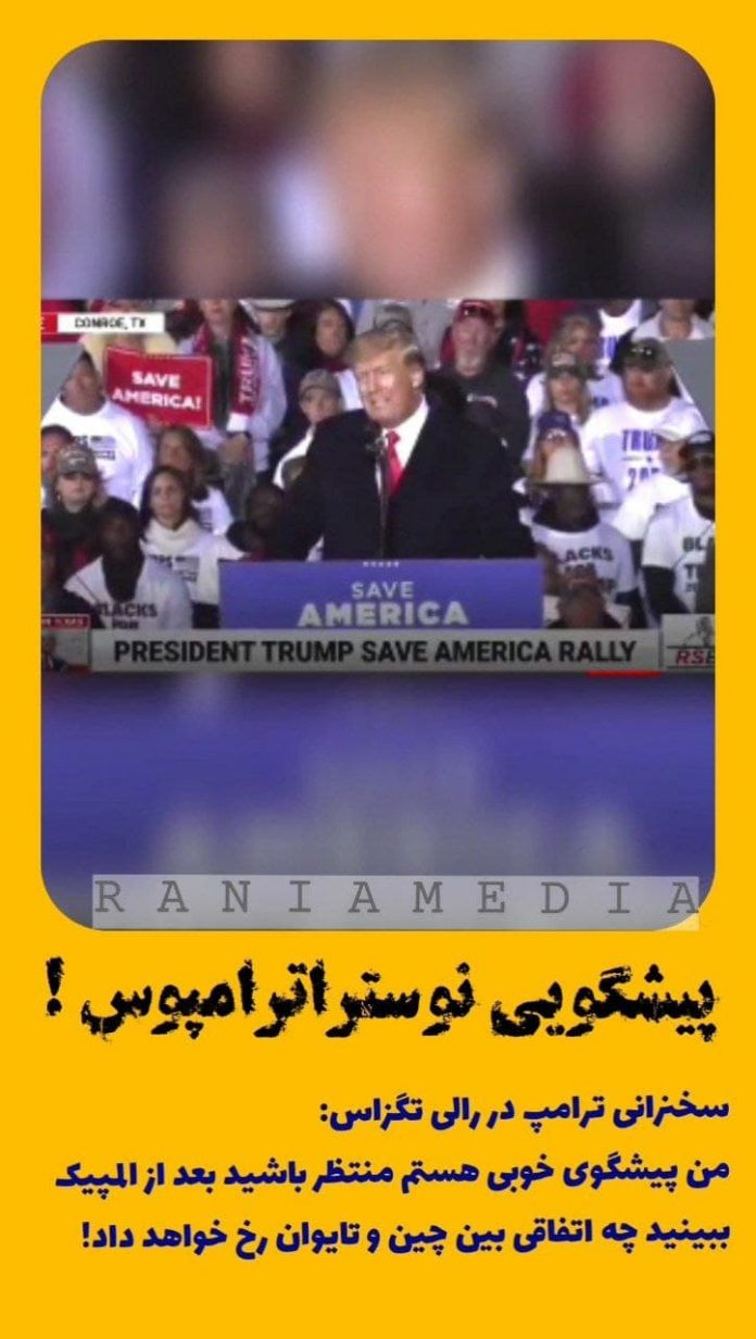 استوریویدئو پیشگویی نوستراترامپوس ! رسانه رانیا - 10 بهمن 1400 سخنرانی ترامپ در رالی تگزاس:من پیشگوی خوبی هستم منتظر باشید بعد از المپیک ببینید چه اتفاقی بین چین و تایوان رخ خواهد داد!
