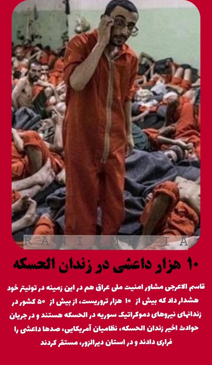 قاسم الاعرجی مشاور امنیت ملی عراق هم در این زمینه در توئیتر خود هشدار داد که بیش از 10 هزار تروریست، از بیش از 50 کشور در زندانهای نیروهای دموکراتیک سوریه در الحسکه هستند و در جریان حوادث اخیر زندان الحسکه، نظامیان آمریکایی، صدها داعشی را فراری دادند و در استان دیرالزور، مستقر کردند