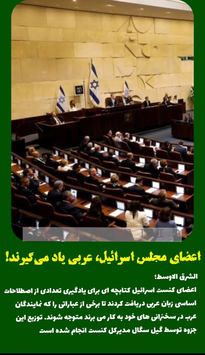 استوریویدئو اعضای مجلس اسرائیل، عربی یاد میگیرند! رسانه رانیا - 14 بهمن 1400 الشرق الاوسط؛ اعضای کنست اسرائیل کتابچه ای برای یادگیری تعدادی از اصطلاحات اساسی زبان عربی دریافت کردند تا برخی از عباراتی را که نمایندگان عرب در سخنرانی های خود به کار می برند متوجه شوند. توزیع این جزوه توسط گیل سگال مدیرکل کنست انجام شده است.