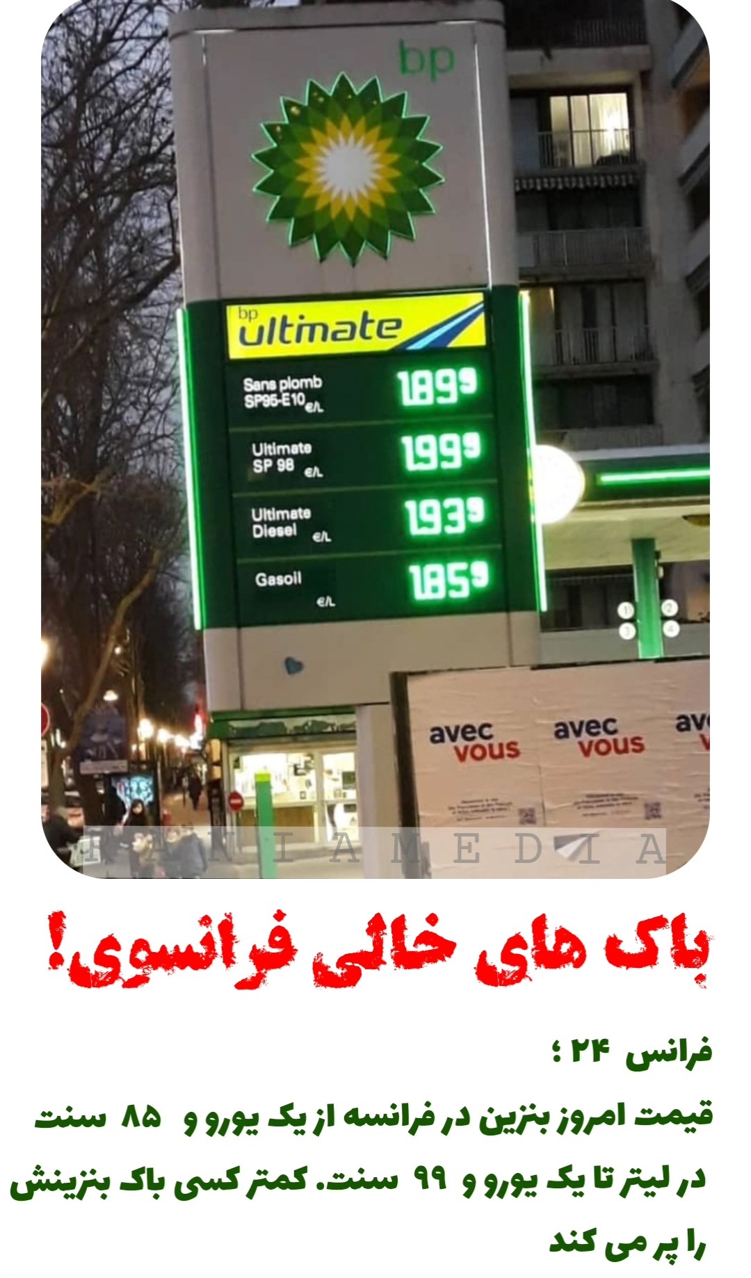 استوریویدئو باک های خالی فرانسوی! رسانه رانیا - 15 بهمن 1400 فرانس ۲۴ ؛قیمت امروز بنزین در فرانسه از یک یورو و ۸۵ سنت در لیتر تا یک یورو و ۹۹ سنت. کمتر کسی باک بنزینش را پر می کند